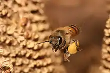 نحلة عسل أوربية تحمل حبوب اللقاح في حقيبتها عائدة بها إلى خليتها