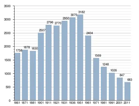 في سنة 1861 بلغ عدد السكان 1٬758 نسمة، وتطور العدد ليصل في سنة 2011 لـ 683 نسمة.