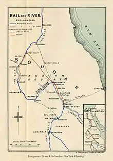 خريطة من القرن التاسع عشر لمسار سكة حديد وقوافل في السودان— متضمنة كورسكو — (1899)"من كتاب تشرشل "حرب الطريق.