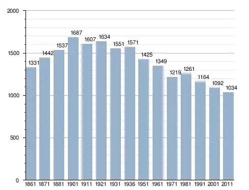 في سنة 1861 بلغ عدد السكان 1٬331 نسمة، وتطور العدد ليصل في سنة 2011 لـ 1٬034 نسمة.