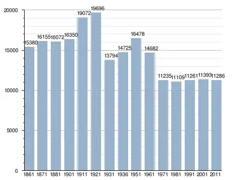 في سنة 1861 بلغ عدد السكان 15٬380 نسمة، وتطور العدد ليصل في سنة 2011 لـ 11٬286 نسمة.