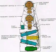 تمت استعادة الفيلم عن طريق محفظة إعادة الإدخال (التي سُميت محفظة الفيلم)، والتي صممتها شركة جنرال إلكتريك، حيث تنفصل المحفظة عن القمر وتسقط على الأرض.[17] بعد زوال الحرارة الشديدة لإعادة الدخول، يُرمى الدرع المحيط بالمركبة على ارتفاع 60 ألف قدم (18 كيلومتر) وتُفتح مظلات الهبوط.[18] من المفترض أن تُلتقط المحفظة وهي في الهواء بواسطة طائرة محلقة تحمل مخلباً في الجو كي يمسك بها ويرفعها، أو قد تسقط المحفظة في البحر.[19] عرضت وكالة رويترز تقريراً عن حادثة مركبة أثناء إعادة الدخول، وهبوطها واكتشافها على يد مزارعين فنزويليين في منتصف عام 1964، لم تصنف الولايات المتحدة المحافظ بالسرية بعد تلك الحادثة، بل عرضت جائزة في ثماني لغات لمن يحصل على المحفظة ويعيدها إلى الولايات المتحدة.[20] في الرحلة رقم 69، استُخدم نظامٌ من محفظتين.[21] وذلك ما سمح للقمر بالتخفي ضمن الوضع الكامن، أي إيقاف التشغيل لمدة تصل إلى 21 يوماً قبل التقاط الصور مجدداً.[9] وفي عام 1963، أُضيف تحسينٌ آخر، وهو “قارب النجاة”، وهو نظام يعمل على البطارية ويسمح بإطلاق واستعادة المحفظة في حالات العطل الكهربائي.[22] كانت الأفلام تُعالج في منشأة إيستمان كوداك هوكي في روشستر في نيويورك.[23]