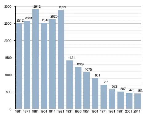في سنة 1861 بلغ عدد السكان 2٬512 نسمة، وتطور العدد ليصل في سنة 2011 لـ 453 نسمة.