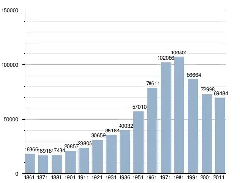 في سنة 1861 بلغ عدد السكان 18٬366 نسمة، وتطور العدد ليصل في سنة 2011 لـ 69٬484 نسمة.