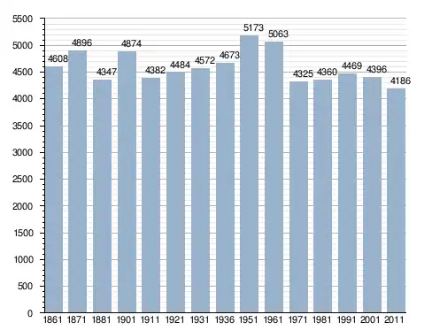 في سنة 1861 بلغ عدد السكان 4٬608 نسمة، وتطور العدد ليصل في سنة 2011 لـ 4٬186 نسمة.