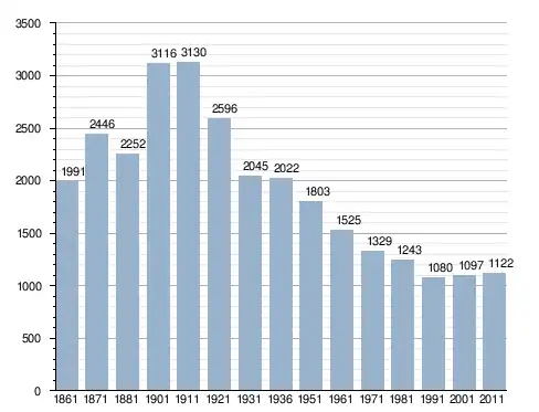 في سنة 1861 بلغ عدد السكان 1٬991 نسمة، وتطور العدد ليصل في سنة 2011 لـ 1٬122 نسمة.