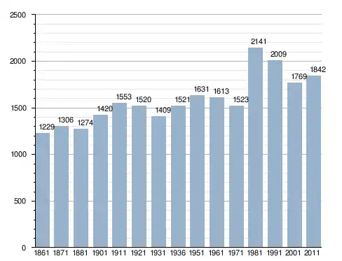 في سنة 1861 بلغ عدد السكان 1٬229 نسمة، وتطور العدد ليصل في سنة 2011 لـ 1٬842 نسمة.