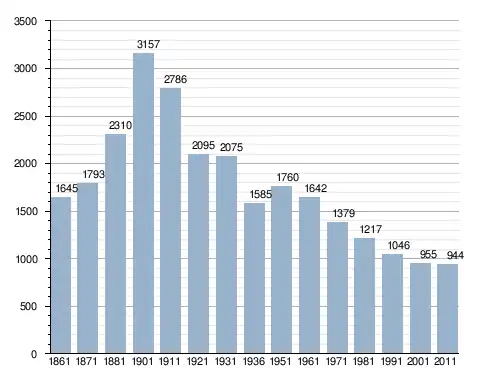 في سنة 1861 بلغ عدد السكان 1٬645 نسمة، وتطور العدد ليصل في سنة 2011 لـ 944 نسمة.