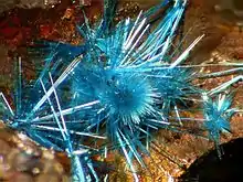 يوجد المعدن على شكل بلورات إبرية زرقاء اللون، وهي تتبع نظام بلوري سداسي.