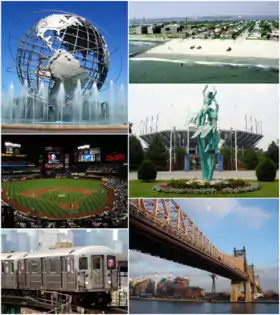 ![]() من أعلى اليسار بإتجاه عقارب الساعة: اليونيسفير، حديقة روكوي، بطولة أمريكا المفتوحة، ملعب بيلي جين كينغ, جسر كوينزبرو، كوينزباوند قطار رقم 7، منظر شاطئي. | ||