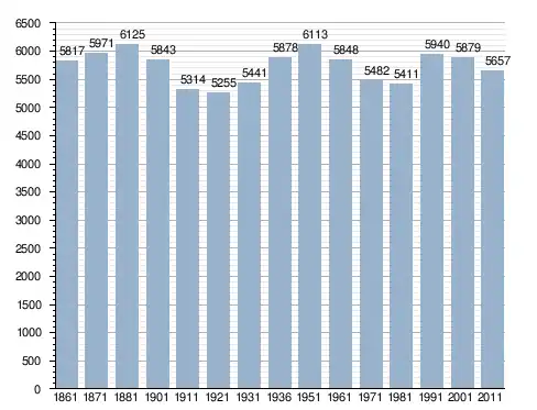 في سنة 1861 بلغ عدد السكان 5٬817 نسمة، وتطور العدد ليصل في سنة 2011 لـ 5٬657 نسمة.