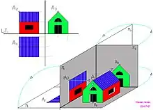 - خطين مستقيمين r s يقعان على نفس المستوى. عندما r s يكونان متوازيين، نقطة تقاطعهم هي نقطة لانهائية؛