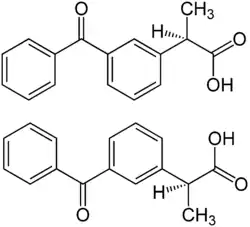 الكيتوبروفين هو راسمي لحمض (RS)-2-(3-benzoylphényl)propionique.