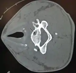 ![]() A bone cyst in the vertebra of the neck as seen on CT A bone cyst in the vertebra of the neck as seen on CT | |