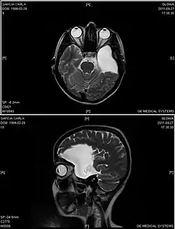 ![]() صورة بالرنين المغناطيسي لامراة تبلغ من العمر 25عامًا مصابة بكيسة عنكبوتية جبهية صدغية يسري. صورة بالرنين المغناطيسي لامراة تبلغ من العمر 25عامًا مصابة بكيسة عنكبوتية جبهية صدغية يسري. | |