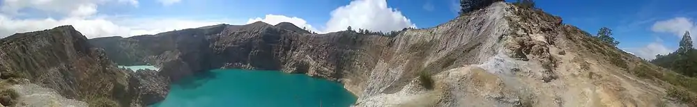 منظر بانورامي للبحيرات الثلاث في كيليموتو ، من اليسار إلى اليمين: Tiwu Ko'o Fai Nuwa Muri ، Tiwu Ata Polo (خلف Tiwu Ko'o Fai Nuwa Muri) ، و Tiwu Ata Bupu (البحيرة السوداء في أقصى اليمين)