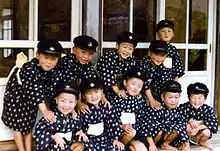 في الفترة المبكرة من فترة شووا بين عامي 1881 وحتى 1945، تلقت الطالبات الإناث في المدارس اليابانية في المرحلة الابتدائية دروس عن كيفية حياكة الملابس عموما والكيمونو خصوصا، وذلك لم يكن بهدف تربية جيل من المتخصصين بالخياطة وإنما من أجل تمكين الإناث من العمل في مصانع الحياكة فيما بعد، بالإضافة إلى تمكينهن من صناعة ملابس لأطفالهن وأفراد أسرهن في المستقبل. في ذلك الوقت كانت الحياكة تتم يدويا بدون استخدام آلات الخياطة.[21]