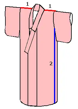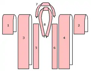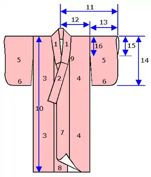 يحتوي الكيمونو تقليديا على 16 جزء:[31]