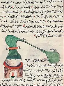 وقد كان من تلاميذ خالد بن يزيد الكيميائي جابر بن حيان الذي يسمى بـ «أبو الكيمياء»،[58] وينسب له وضع أسس الكيمياء الحديثة، وقد وضع تصانيف كثيرةً في الكيمياء، قيل: عددها 232 كتابا، وقيل: بلغت خمسمائة.[61] وضاع أكثرها، وتُرجم بعض ما بقي منها إلى اللاتينية.[62] وقد صنع جابر بن حيان أهم الحموض المعدنية، مثل حمض النتريك، وحمض الكبريت وحمض هيدروكلوريك.[63] وبقيت من أهم المركبات في الصناعة الكيميائية لأكثر من ألف عام. وهو أول من حضّر حمض الكبريتيك وسماه زيت الزاج، وأول من استحضر ماء الذهب، وينسب إليه تحضير بعض المركبات الكيميائية الأخرى. وقد درس خصائص مركبات الزئبق واستحضرها.[64][65] وهو أول من وصف أعمال التقطير والتبلور والتذويب والتحويل إلخ.[54][66][67][68][69] وقد قام جابر بن حيان أيضًا باختراع الإنبيق، كما قام باختراع المقطرة والمعوجة كجزء من الإنبيق.[70][71]