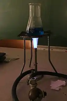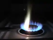 اختبار اللهب هو نسخة أكثر شيوعًا من الاختبار الكيميائي. يتم استخدامه فقط على أيونات المعادن. يحترق الغبار المعدني ، مما يتسبب في انبعاث الألوان اعتمادًا على ما تم حرق المعدن به.[8] على سبيل المثال ، احتراق الكالسيوم (Ca) يعطي اللون البرتقالي والنحاس (Cu) يحترق باللون الأزرق. وتُستخدم انبعاثات الألوان لإنتاج ألوان زاهية في الألعاب النارية.