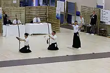- أشي بومي (足踏み): وتعني حرفياً "خطوة القدم" وتكون بالخطو بالقدم خطوة واحدة والتباعد بين القدمين أثناء مواجهة الهدف.