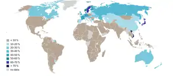 وهناك دراسات أخرى حددت النسبة التقديرية للمُلحدين واللاأدريين وغير المؤمنين بوجود إله شخصي بأنها نسبة منخفضة أحادية الرقم كما في بولندا ورومانيا وقبرص ودول أوروبية أخرى، ووصولًا إلى 60% في فنلندا و72% في النرويج و80% في الدنمارك و78% في السويد.[86] ووفقا للدراسات الاستقصائية ليوروباروميتر عام 2010، فإن 51% من دول الاتحاد الأوروبي يؤمنون بوجود إله، بينما يُؤمن 26% بوجود نوع من الروح أو القوة العليا، وهناك نسبة 20% لا يؤمنون بما سبق، فيما بقيت نسبة 3% لم تضح لديهم الرؤية بشكل كافٍ.[87] ووفقًا للمكتب الأسترالي للإحصاء عام 2011، فإن هناك نسبة 22% من الأستراليين بلا دين، وهي الفئة التي تشمل اللاأدريين أيضًا.[88] كما أن هناك نسبة ما بين 64% و65% من اليابانيين،[86] و81% من الفيتناميين[89] مُلحدين ولاأدريين، أو لا يؤمنون بوجود إله.