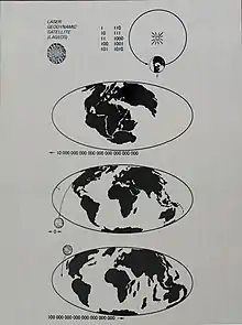 يحتوي لاجيوس-1 (الذي من المتوقع دخوله إلى غلافنا الجوي بعد 8.4 مليون سنة[7]) لويحة من تصميم كارل ساغان لتبيّن للبشر في المسقبل موعد إطلاقه، وتتضمن اللويحة الأعداد من 1 إلى 10 بالنظام الثنائي. وفي الزاوية العلوية اليمنى مخطط للأرض تدور حول الشمس ويشير العدد 1 بالنظام الثنائي إلى دورة واحدة تعادل سنة واحدة وتُظهر أيضًا 268435456 سنة في الماضي (بالنظام الثنائي 228) ومؤَشر عليها بسهم يساري، بالإضافة إلى توزيع القارات على كوكب الأرض في ذلك الوقت بينما تم الإشارة إلى التوزيع الحالي للقارات بصفر وسهمان أمامي وخلفي، وأيضًا تمت الإشارة إلى التوزيع المُحتمل للقارات على كوكب الأرض ب سهم أمامي والعدد 8388608 (بالنظام الثنائي 223).[8][9]
