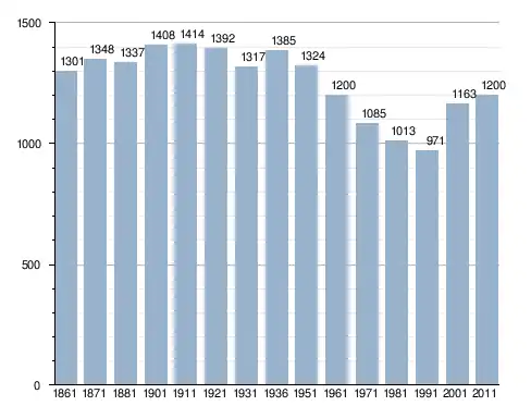 في سنة 1861 بلغ عدد السكان 1٬301 نسمة، وتطور العدد ليصل في سنة 2011 لـ 1٬200 نسمة.