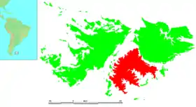 توضِّح المساحة الحمراء موقع شبه جزيرة لافيونا بين جزر فوكلاند.