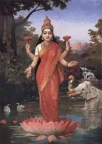 لاكشمي (بالسنسكريتية: लक्ष्मी، بالأبجدية الدولية السنسكريتية: lakṣhmī) هي الإلهة التي تقود المرء إلى هدفه (lakshya بالسنسكريتية)، ومن هنا اشتُق اسمها لاكشمي. هناك ثمانية أنواع من الأهداف الضرورية للبشرية هي: التنوير الروحي، والغذاء، والمعرفة، والموارد، والذرية، والوفرة، والصبر والنجاح، وبالتالي هناك 8، أو أشتا، أشكال للاكشمي - آدي لاكشمي، ودانيا لاكشمي، وفيديا لاكشمي، ودانا لاكشمي، وسانتانا لاكشمي، وغاجا لاكشمي، ودهرية لاكشمي وفيجايا لاكشمي. ذُكرت أول مرة في ترنيمة شري سوكتا من الريجفدا، يُمثل شري، وهو مصطلح شرفي للاكشمي، العالم المادي لممكلة الأرض باعتباره الإلهة الأم، التي يُشار إليها باسم بريثفي ماتا، وتُعرف بشخصيتيها التوأم باسم بيتشيو ديفي، وشريديفي (لديها شكل بالإضافة إلى هذين يسمى نيلا ديفي). وهي زوجة فيشنو، وإحدى الآلهة الهندوسية الرئيسية والكائن الأسمى في التقاليد الفيشنوية. تُشكل مع بارفاتي وساراسواتي التريديفي، أو الثالوث المقدس. تُعتبر لاكشمي أيضًا إلهة مهمة في الجاينية وتوجد في المعابد الجاينية. كانت لاكشمي إلهة الوفرة والثروة للبوذيين، ومُثّلت في أقدم الستوبات ومعابد الكهوف البوذية الباقية. تعكس إلهة لاكشمي فاسودارا لدى الطوائف البوذية في التبت ونيبال وجنوب شرق آسيا، خصائص وسمات الإلهة الهندوسية لاكشمي مع اختلافات أيقونية طفيفة.[1][2]