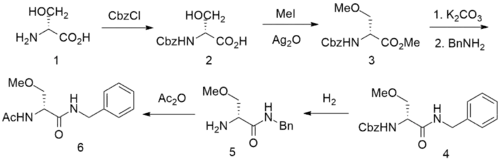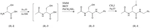 يُعالج حمض R)-2-amino-3-hydroxypropanoic) بأنهيدريد الخليك وحمض الخليك. ثم يُعالج الناتج بـ N-methylmorpholine، وisobutyl chloroformate، وبنزيل أمين أولاً. ثم يُعالج ثانياً بالميثيل يوديد (Methyl iodide) وأكسيد الفضة الأحادية ليكوّن اللاكوساميد. وقد اقتُرحت طرق أكثر كفاءة للتركيب في السنوات الأخيرة، منها ما يلي:[43][44]