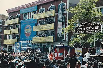 استعراض لاگ بـَعومـِر، يخطب فيه الربه مناحم شنيرسون، أمام رئاسة خباد في 770 Eastern Parkway, بروكلين، نيويورك، في 1987.