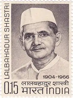 لال بهادور شاستري (1904 - 1966 م) هو ثاني رئيس وزراء لجمهورية الهند. شارك منذ نعومة أظفاره في الحركة الوطنية الهندية. خلف جواهر لال نهرو في رئاسة الوزراء. توفي بنوبة قلبية أصابته بعد أن وقّع ميثاق عدم اعتداء مع باكستان، في الاتحاد السوفياتي ، فخلفته في رئاسة الوزارة أنديرا غاندي.[12]