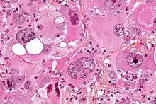 صورة مجهرية توضح اللانمطية النووية القصوى في السرطان (الورم الأرومي الدبقي). خزعة دماغية. ملون هيماتوكسيلين فلوكسين زعفران (HPS stain).
