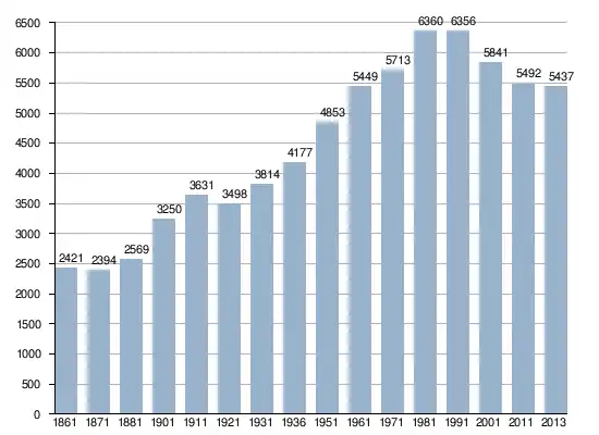 في سنة 1861 بلغ عدد السكان 2٬421 نسمة، وتطور العدد ليصل في سنة 2013 لـ 5٬437 نسمة.
