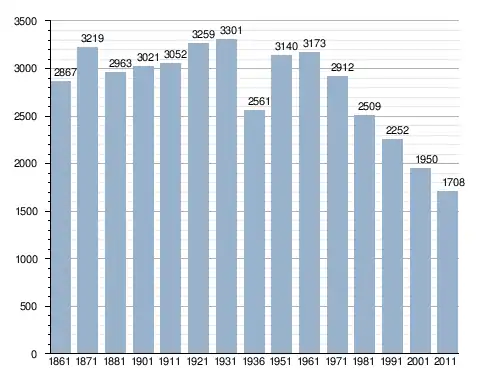 في سنة 1861 بلغ عدد السكان 2٬867 نسمة، وتطور العدد ليصل في سنة 2011 لـ 1٬708 نسمة.