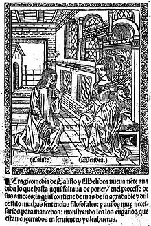 يبدأ العمل عندما يرى كاليستو مليبيا صدفةً في حديقة منزله بينما كان يبحث عن صقره ويطالبها أن تبادله الحب. تقابله مليبيا بالرفض ولكن بعد فوات الأوان فلقد أصبح متيمًا بها. ويلجأ كاليستو، بناءً على نصيحة خادمه سمبرونيو، إلى العاهرة القديمة ثلستينا والتي أصبحت الآن قوادة. وأيضًا تعمل كبائعة للأغراض المختلفة مما يُمكنها من دخول المنازل. وبهذه الطريقة كانت تعمل كخاطبة وكانت تتمكن من تدبير المواعيد الغرامية. كما كانت تدير بيتًا للدعارة، وكان يعمل لديها اثنتان من تلاميذاتها العاهرات وهم أريوسا وإليثيا. ويحاول الخادم الآخر لكاليستو، بارمنو والتي كانت أمه معلمة ثلستينا، ردعه ولكن يهينه سيده الذي كان يهتم فقط بإشباع رغباته.[71] يتحد بارمنو مع سمبرونيو وثلستينا لاستغلال عشق كاليستو لمليبيا ويقومون بتوزيع الهدايا والمكافأت التي يعطيها لهم. وتتحكم ثلستينا ببارمنو، مُستغله مهاراتها الجدلية ووعدها له بالحصول على واحدة من تلميذاتها والتقرب منها. وبالمثل كانت تستخدم هذه المهارات إلى جانب تعويذة موجهه للإله بلوتو وتجعل مليبيا تقع في حب كاليستو. وتقديرًا لجهودها، يهديها كاليستو قلادة من الذهب، ولكن تصبح القلادة مجالًا للخلاف، فلقد دفعها جشعها إلى أن ترفض تقاسمها مع خادمي كاليستو الذين انتهى بهم المطاف إلى قتلها، فاُلقي القبض عليهم وتم إعدامهم. فيما تتآمر كلًا من إليثيا وأريوسا، واللتان فقدتا ثلستينا وعشيقيهما، لجعل الثرثار ثينتوريو يقتل كاليستو، إلا أنه فقط يثير ضجة ولا يتمم الأمر. وبينما كاليستو ومليبيا مستغرقان في حبهما، يسمعان ضجة في الشارع ويعتقد كاليستو أن خدمه في خطر، فيحاول القفز من فوق سور منزل حبيبته ولكنه ينزلق ويلقى مصرعه. وتتبعه اليائسة مليبيا منتحرة. وينتهي العمل ببكاء بلبريو والد مليبيا رثائًا على وفاة ابنته.[72][73]