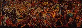 بينما يركز الجانب الأيسر على الشكل الذي يبدو كشيخ دُرزي خارج من صورة طائرة وهو يدعو يائساً.[10] ويحيط به على اليسار حصان صاخب في حين ترقد أمامه عذراء قُتلت وغُطيت بعلم لبنان أما خلفه فتبرز قبضات مظلمة في هيئة مخالب زاحفة. وفوقه، يغطي طائر مُجنح نصف شمس مخفية وهو يحلق فوق أكناف الأشجار مُطلقاً لهيباً يحيط بأطفال رُضْع يطوفون حول قوس من أذرع عريضة تندفع من هيئة متضرعة أسفلهم.[11]