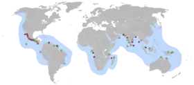 ![]() انتشار لجأة ردلي الزيتونية الجغرافيُّ عالمياً، تمثِّل النقاط الحمراء مواقع التعشيش الأساسية، والنقاط الصفراء المواقع الثانوية | |