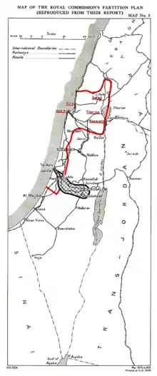 مقترح التقسيم وفق لجنة بيل. الدولة اليهودية المقترحة محاطة بالخط الأحمر، بينما القدس تبقى تحت الانتداب البريطاني، والباقي للدولة العربية.