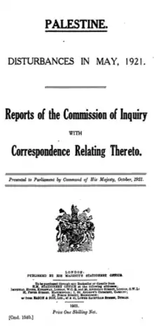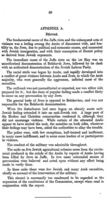 خلص التقرير إلى أن أعمال العنف المقترفة من قبل العرب ضد اليهود كانت على ما يبدو بسبب اشتباك وقع بين الحزب الشيوعي اليهودي أو البلاشڤة وحزب العمال اليهودي المفوض لكن هذا "لم يكن ليزيد عن إشعال شغب شوارع من النوع العادي".