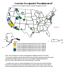 | جسيمات معلقة (PM10) | ابتدائي وثانوي | 150 μg/m³ | 24-ساعة | لا يجب التعرض له أكثر من مرة في العام على مدى ثلاث سنوات | 40 C.F.R. 50.6a |