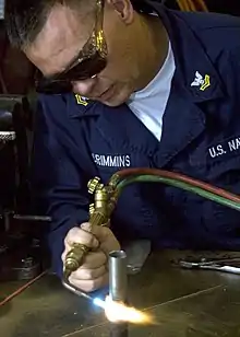 عامل يستخدم طريقة اللحام بالمونة في الصناعة