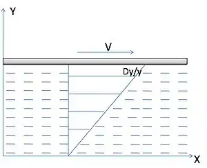 نفترض وجود لوحين متوازيين بينهما مسافة x ومساحة كل منهما A، ونقترض وجود سائل يملأ المكان بين اللوحين. فإذا بدأنا تحريك اللوح 2 يسرعة ثابتة v فتتحرك طبقة السائل الملاصقة للوح 2 أيضا بالسرعة v. وبما أن اللوح 1 ثابت لا يتحرك فإن طبقة السائل الملاصقة له تبقى لا تتحرك. أي أن طبقات السائل بين اللوحين ستتحرك بسرعات متناسبة طرديا مع المسافة بين اللوحين (انظر الشكل، حيث يتناسب كل سهم مع سرعته).