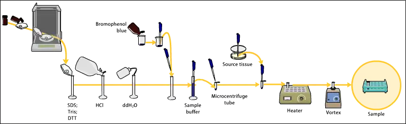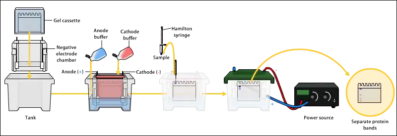 يتم تحميل العينات في آبار في الهلام. يتم حفظ إحدي الأسطر للـ درج أو العلامات، وهما خليط متوفر تجارياً من عدة بروتينات معروفة الوزن الجزيئي، عادة ما تكون مصبوغة لكي تُظهر حزم ملونة مرئية. أحد الأمثلة على الدرج، هو درج الأوزان الجزيئية الكامل المدى لشركة GE (كما في الشكل). عندما يتم تطبيق فرق الجهد على الهلام، تهاجر البروتينات ضمنه بسرع مختلفة. هذه المعدلات الزمنية المختلفة للتقدم (حركات الفصل الكهربائي المختلفة) تُفصل إلى حُزم ضم كل سطر.