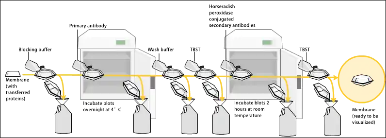 بعد عملية السد، يتم احتضان الغشاء في محلول مخفف من الجسم المضاد الأولي (عادة بتركيز بين 0,5 ميكروغرام/مل إلى 5 ميكروغرام/مل) مع التحريك الخفيف. بشكله النموذجي، يحتوي المحلول على محاليل ملحية مع نسبة صغيرة من المنظفات، وأحياناً مسحوق حليب أو ألبومين مصل البقر BSA. يمكن وضع محلول الجسم المضاد والغشاء معاً واحتضانهما لأي فترة بين 30 دقيقة إلى عبر الليل. ويمكن أيضاً احتضانهما في درجات حرارة مختلفة، حيث تكون الدرجات الدافئة أكثر محفزة على الالتصاق (لكلا نوعي الالتصاق، الالتصاق المحدد والالتصاق الغير محدد "التشويش").