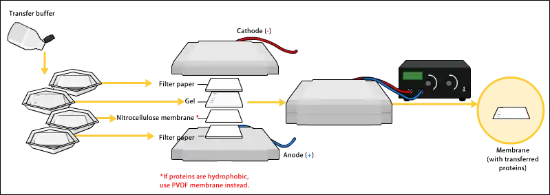 من أجل جعل الوصول للبروتينات أسهل للاكتشاف بالأجسام المضادة، يتم نقلهم من الهلام إلى غشاء مصنوع من النيتروسيليوز أو الـPVDF. يتم وضع هذا الغشاء فوق الهلام، ووضع مجموعة من طبقات أوراق الترشيح فوق ذلك. ثم يتم وضع الطبقات كلها في محلول يقوم بالتنقل إلى الأعلى عبر الأوراق بالخاصية الشعرية Capillary action، جالباً البروتينات معه إلى الغشاء.