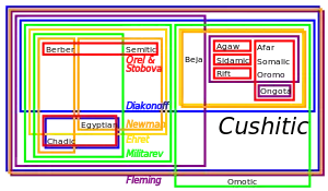 - لا يوجد توافق في الآراء بشأن العلاقات المتبادلة بين الفروع الخمس غير الأوموتية من اللغات الأفريقية الآسيوية. هذا الموقف ليس غريبًا، حتى بين العائلات اللغوية الراسخة منذ القدم: إذ على سبيل المثال: كثيرًا ما يختلف العلماء بشأن التصنيف الداخلي للغات الهندية الأوروبية.