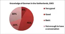 وهناك تقليد تعلم اللغات الأجنبية في هولندا: فنحو 89 ٪ من مجموع السكان لديهم معرفة جيدة باللغة الإنجليزية، و70٪ ألمانية و29٪ فرنسية، و5٪ إسبانية.