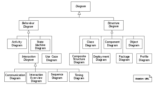تحتوي UML على العديد من المخططات ويمكن تصنيفها هرميا بالشكل التالي: